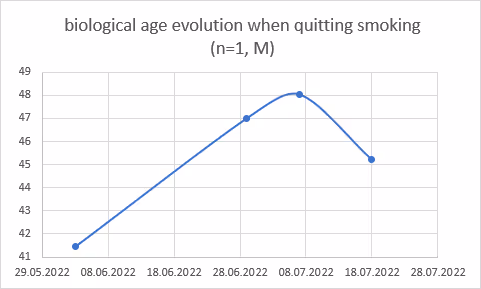 Wie wir wissen, wirken sich sowohl Gewichtszunahme (vgl. z.B. Rajado & al. 2023; Galkin & al. 2023) als auch akuter Stress (vgl. z.B. Poganik, Horvath & al. 2023) negativ auf das biologische Alter aus. Das musste auch unser Proband (N=1; M) feststellen, nachdem er mit dem Rauchen aufgehört hatte – auch wenn er den Entzug zunächst mit nikotinhaltigen Kaugummis abgemildert hatte. Tatsächlich nahm er im Laufe der folgenden zwei Monate etwa fünf kg zu, und sein BMI (über 25) hat sich seitdem nicht mehr verändert. Als er im gleichen Zeitraum sein biologisches Alter beobachtete, fiel ihm ein steiler Anstieg (um fast sieben Jahre!) auf, der erst nach einem Monat langsam zurückging.
