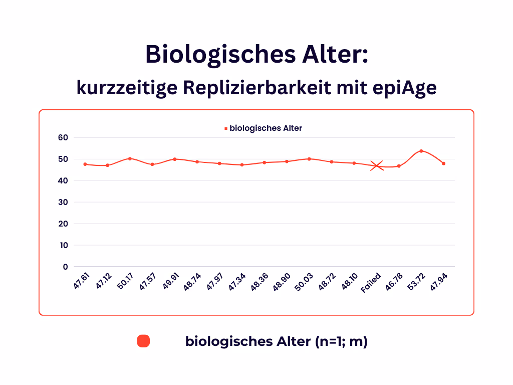 Vielleicht fragen Sie sich jetzt: Wie schafft es epiAge denn? Nun, es ist sicher zielfördernd, dass wir uns auf 13 CpGs konzentrieren, die besonders gut mit dem Alterungsprozess korrelieren. Überdies gewährleistet unser Next Generation Sequencing (NGS)-Ansatz eine repräsentativere und reichhaltigere Sequenzierung dieser entscheidenden Bereiche. „Schlankes Design für Konsistenz bei der Replikation“ könnte das Motto unseres Tests lauten – was zu einer ziemlich beeindruckenden Beständigkeit führt! Genau deswegen verlassen sich so viele Ärzte und Biohacker auf den epiAge-Test, um ihre kurz- und langfristigen Interventionen zu überwachen.